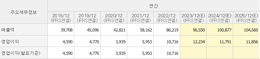 눈에 띄는 점은 21년 매출 5조 8천억에서 22년 매출 8조 6천억으로 엄청난 성장을 하고 있다는 점이다.